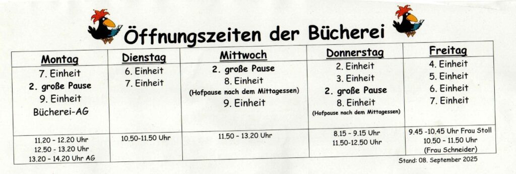 Öffnungszeiten der Bücherei (SJ 2025/26)